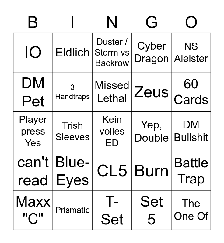 This bingo card has 25 words: Blue-Eyes, T-Set, Missed Lethal, Maxx "C", NS Aleister, IO, DM Pet, Eldlich, Yep, Double, CL5, Zeus, Player press Yes, Burn, Battle Trap, 3 Handtraps, The One Of, DM Bullshit, Duster / Storm vs Backrow, 60 Cards, Trish Sleeves, Kein volles ED, Prismatic, can't read, Cyber Dragon and Set 5.