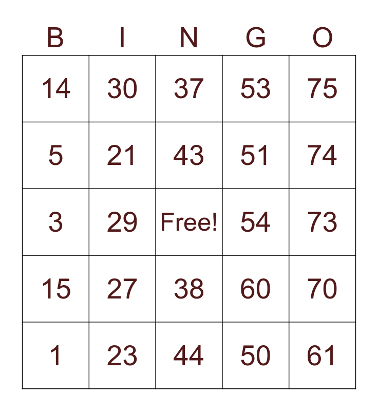 This bingo card has a free space and 24 words: 1, 27, 43, 50, 75, 14, 30, 37, 54, 73, 3, 21, 60, 70, 5, 23, 44, 53, 74, 15, 29, 38, 51 and 61.