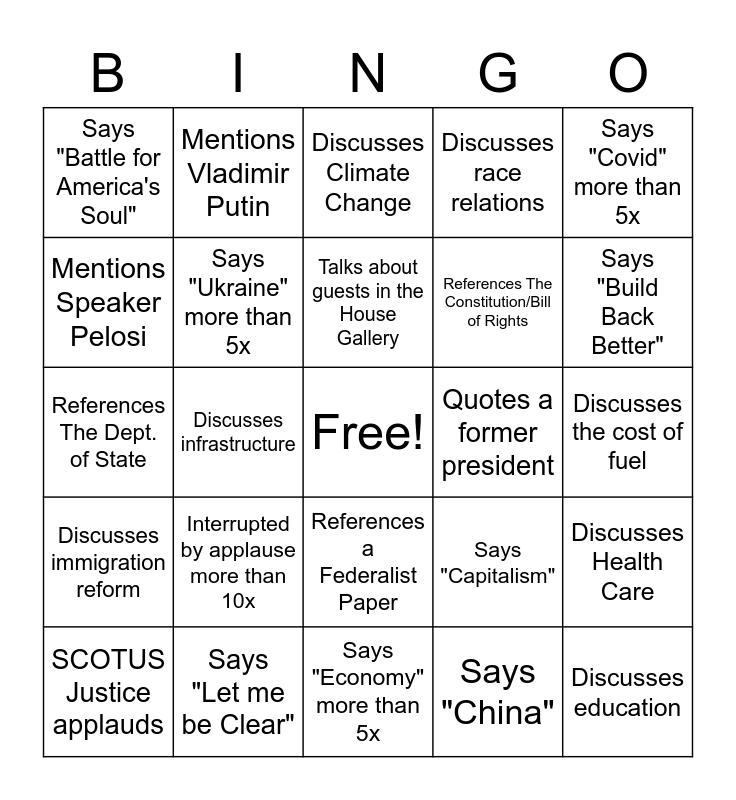 This bingo card has a free space and 24 words: Interrupted by applause more than 10x, Says "Let me be Clear", Talks about guests in the House Gallery, SCOTUS Justice applauds, Says "Covid" more than 5x, Says "Battle for America's Soul", Mentions Speaker Pelosi, Mentions Vladimir Putin, Quotes a former president, References a Federalist Paper, References The Constitution/Bill of Rights, References The Dept. of State, Says "Capitalism", Discusses Health Care, Says "Ukraine" more than 5x, Says "China", Discusses the cost of fuel, Discusses Climate Change, Says "Build Back Better", Discusses infrastructure, Discusses education, Discusses immigration reform, Discusses race relations and Says "Economy" more than 5x.
