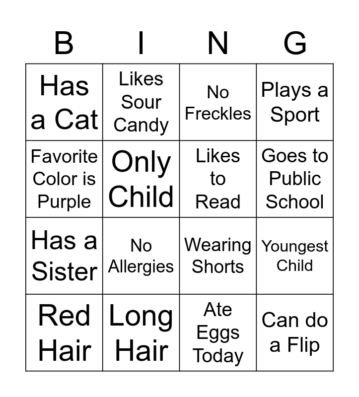 This bingo card has 16 words: Long Hair, Youngest Child, No Freckles, Has a Cat, Has a Sister, Likes Sour Candy, Wearing Shorts, Ate Eggs Today, Favorite Color is Purple, Only Child, Red Hair, Plays a Sport, No Allergies, Goes to Public School, Likes to Read and Can do a Flip.