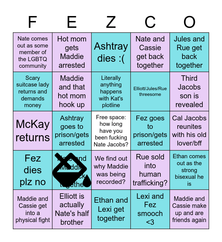 This bingo card has 1 images, a free space and 24 words: Nate and Maddie get back togethe, Elliott is actually Nate's half brother, Literally anything happens with Kat's plotline, Maddie and Cassie get into a physical fight, Jules and Rue get back together, Nate comes out as some member of the LGBTQ community, Scary suitcase lady returns and demands money, Hot mom gets Maddie arrested, Fez goes to prison/gets arrested, We find out why Maddie was being recorded?, Elliott/Jules/Rue threesome, McKay returns, Rue sold into human trafficking?, Ethan comes out as the strong bisexual he is, Maddie and that hot mom hook up, Lexi and Fez smooch <3, Cal Jacobs reunites with his old lover/bff, Ashtray dies :(, Third Jacobs son is revealed, Ashtray goes to prison/gets arrested, Maddie and Cassie make up and are friends again, Fez dies plz no, Nate and Cassie get back together and Ethan and Lexi get together.