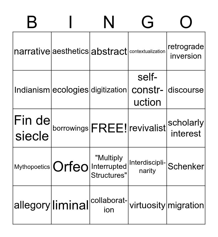 This bingo card has a free space and 24 words: Orfeo, liminal, digitization, allegory, retrograde inversion, narrative, Indianism, aesthetics, revivalist, "Multiply Interrupted Structures", self-constr-uction, Fin de siecle, Interdiscipli-narity, Schenker, ecologies, virtuosity, scholarly interest, abstract, discourse, borrowings, migration, Mythopoetics, contextualization and collaborat- ion.