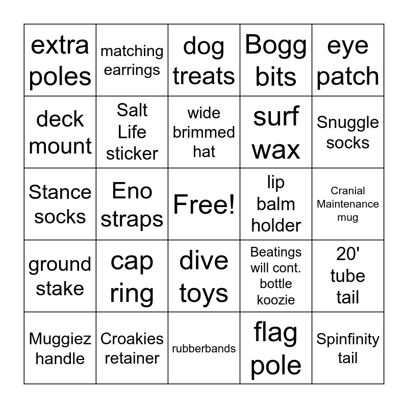 This bingo card has a free space and 28 words: 20' tube tail, stickers, surf wax, flag pole, deck mount, dog treats, matching earrings, ground stake, lip balm holder, Muggiez handle, Stance socks, Bogg bits, Croakies retainer, rubberbands, Snuggle socks, straw lid, cap ring, Salt Life sticker, wide brimmed hat, dive toys, extra poles, kite tote bag, Spinfinity tail, Eno straps, Cranial Maintenance mug, Beatings will cont. bottle koozie, eye patch and aloe lotion.