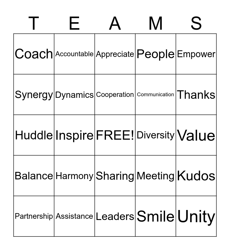 This bingo card has a free space and 24 words: Harmony, Assistance, Cooperation, Partnership, Empower, Coach, Synergy, Accountable, Diversity, Sharing, Communication, Huddle, Meeting, Kudos, Dynamics, Smile, Value, Appreciate, Thanks, Inspire, Unity, Balance, People and Leaders.