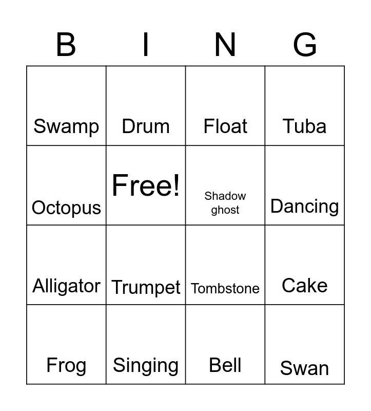 This bingo card has 48 words: Crown, Frog, Star, Beignet, Coffee, Riverboat, Drum, Trombone, Free!, Skull & crossbones, Shadow ghost, Tuba, tarot cards, Totem, Saxophone, Jester, Dancing, Singing, Toga, Octopus, Cake, Balloons, Swamp, Alligator, Snake, Trumpet, Turtle, Firefly, Butterfly, Swan, Lilly pad, Dandelion, Voodoo doll, Rifle, Pumpkin, Mushroom, Heart, Bell, Candle, Spoonbill, Coins, Clarinet, Float, Confetti, Tombstone, Fleur de lis, Streetcar and Mausoleum.