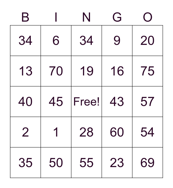This bingo card has a free space and 24 words: 1, 50, 19, 35, 20, 34, 13, 6, 43, 28, 16, 40, 60, 54, 70, 23, 57, 34, 75, 45, 69, 2, 9 and 55.