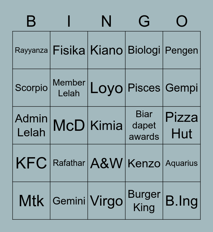 This bingo card has a free space and 24 words: Mtk, Rafathar, Loyo, Burger King, Pengen, Rayyanza, Fisika, Kiano, Biar dapet awards, Pizza Hut, Admin Lelah, Member Lelah, Kenzo, Aquarius, Scorpio, Gemini, Virgo, Biologi, Gempi, KFC, McD, A&W, Pisces and B.Ing.