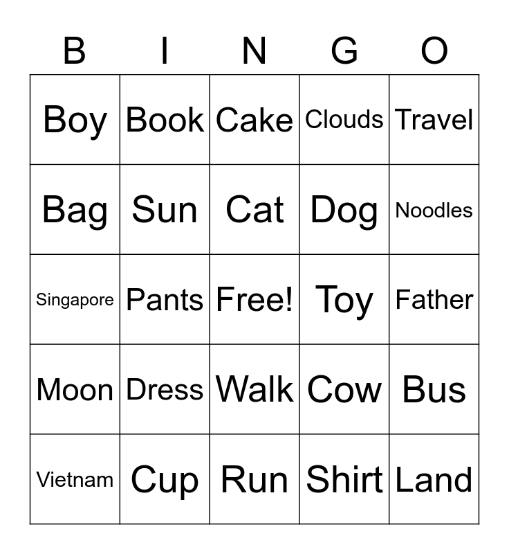 This bingo card has a free space and 59 words: Bed, Cup, Friend, Moon, Shirt, Sad, Sun, Pencil, Dog, Ice, Clouds, Wallet, Bag, Bird, Water, Boy, Land, Travel, Tour, Cat, Toy, Cake, Vietnam, Bus, Fish, Lorry, Happy, Bus, Noodles, Ball, Birds, Pen, Coffee, Angry, Book, Building, Beach, Pants, Rice, Singapore, Cars, Dress, Father, Mother, Brother, Sister, Grandmother, Grandfather, Walk, Run, Eat, Jump, Flow, Chicken, Sheep, Cow, Horse, Tea and Girl.