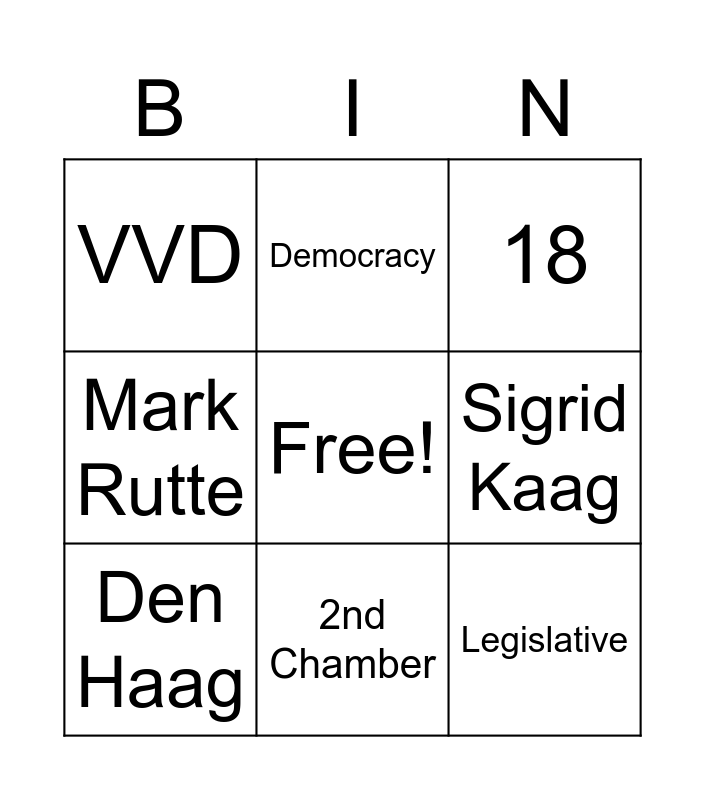 This bingo card has a free space and 8 words: Sigrid Kaag, 18, Democracy, Den Haag, VVD, Legislative, Mark Rutte and 2nd Chamber.
