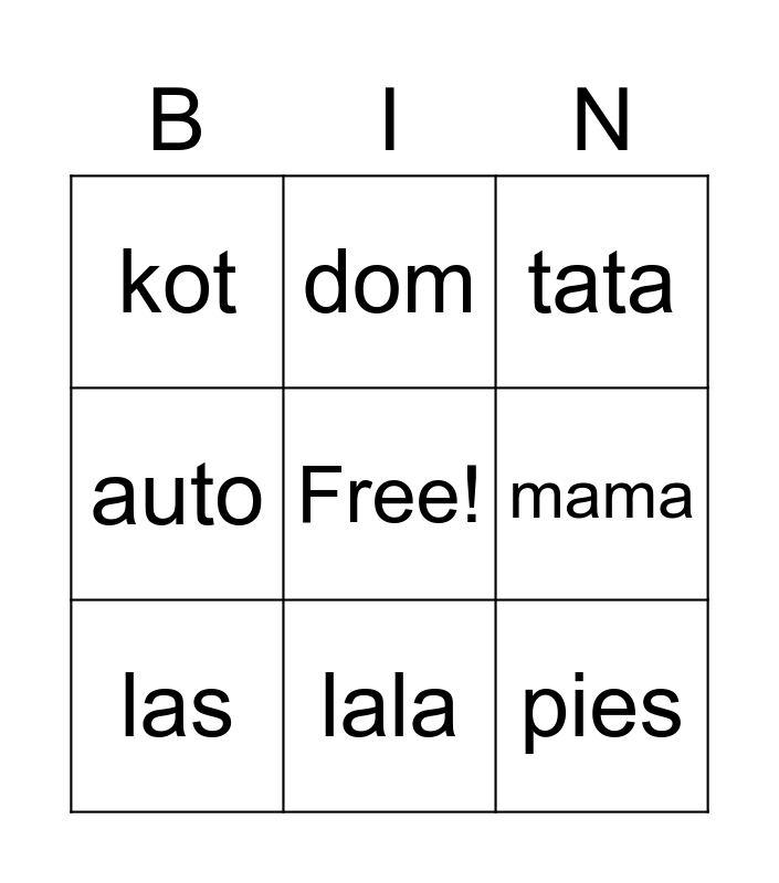 This bingo card has a free space and 8 words: mama, tata, dom, las, kot, pies, auto and lala.