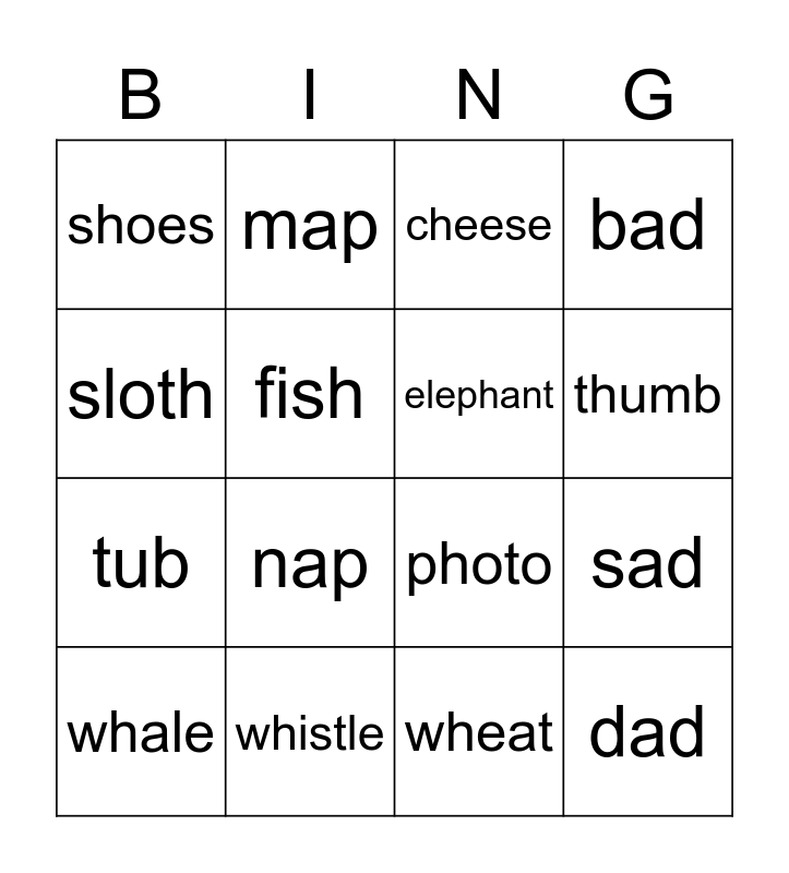 This bingo card has 41 words: Free!, photo, phone, elephant, trophy, three, thumb, earth, sloth, dad, sad, bad, whale, wheat, whistle, shark, ship, shoes, chips, cheese, chess, zip, mop, tub, mat, hat, bat, rat, nap, cap, gap, map, pan, web, shirt, fish, whisk, white, alphabet, dolphin and thursday.