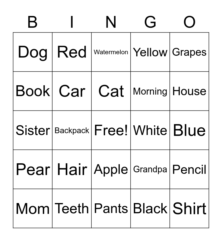 This bingo card has a free space and 34 words: Dad, Black, Kitchen, Rabbit, Pear, Car, Grapes, Mom, Red, Green, Cat, Watermelon, Bathroom, Grandma, White, House, Teeth, Sister, Hair, Grandpa, Apple, Brother, Dog, Blue, Pants, Shirt, Yellow, Bus, Morning, Book, School, Backpack, Pencil and Name.