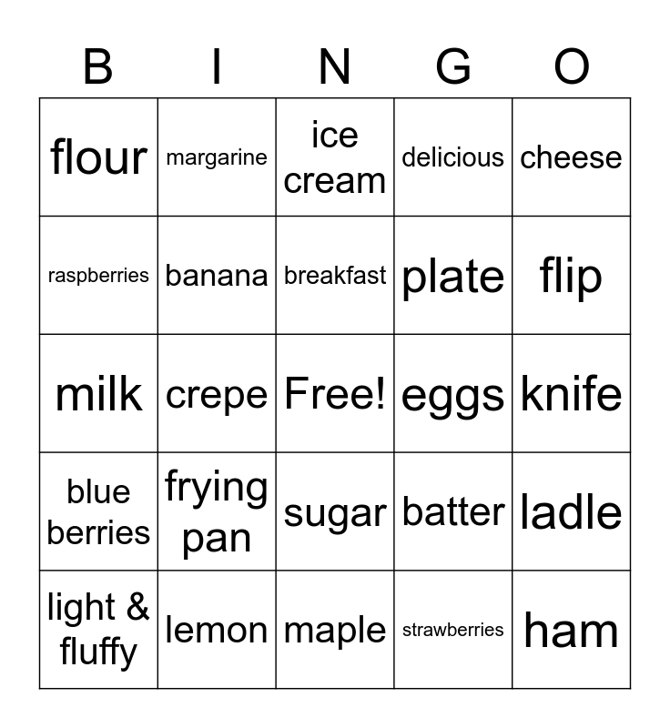 This bingo card has a free space and 36 words: american, bacon, baking powder, banana, batter, blue berries, breakfast, buttermilk, cheese, chocolate, crepe, delicious, dessert, eggs, flip, flour, fork, frying pan, ham, ice cream, knife, ladle, lemon, light & fluffy, maple, margarine, milk, nutella, plate, raspberries, savoury, stack, strawberries, sugar, sweet and syrup.
