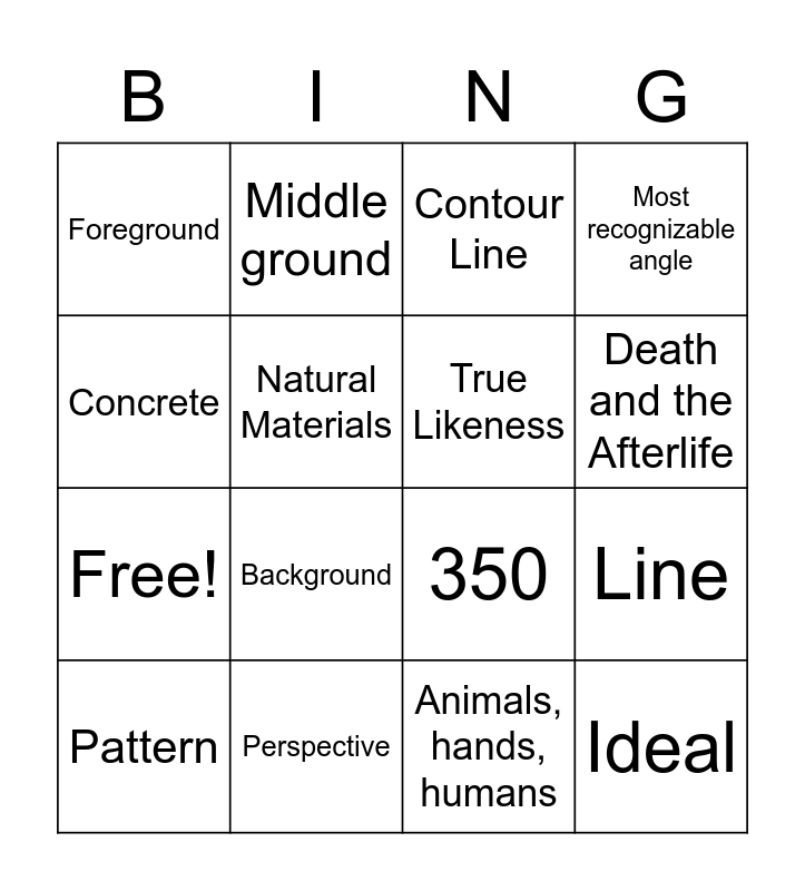 This bingo card has 20 words: Line, Abstract Line, Contour Line, Horizon Line, Pattern, Concrete, Perspective, Foreground, Free!, Middle ground, Background, 350, Natural Materials, Ideal, True Likeness, Copy Art from the past, Death and the Afterlife, Most recognizable angle, Animals, hands, humans and Red-figure-ware.