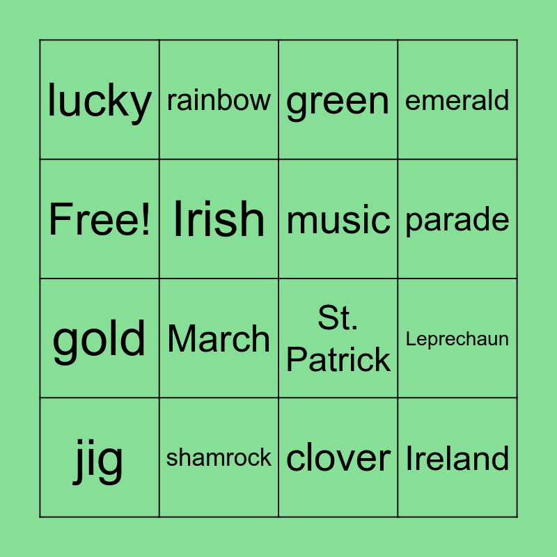This bingo card has 16 words: shamrock, Leprechaun, green, lucky, gold, rainbow, St. Patrick, clover, Free!, Irish, jig, emerald, March, parade, music and Ireland.