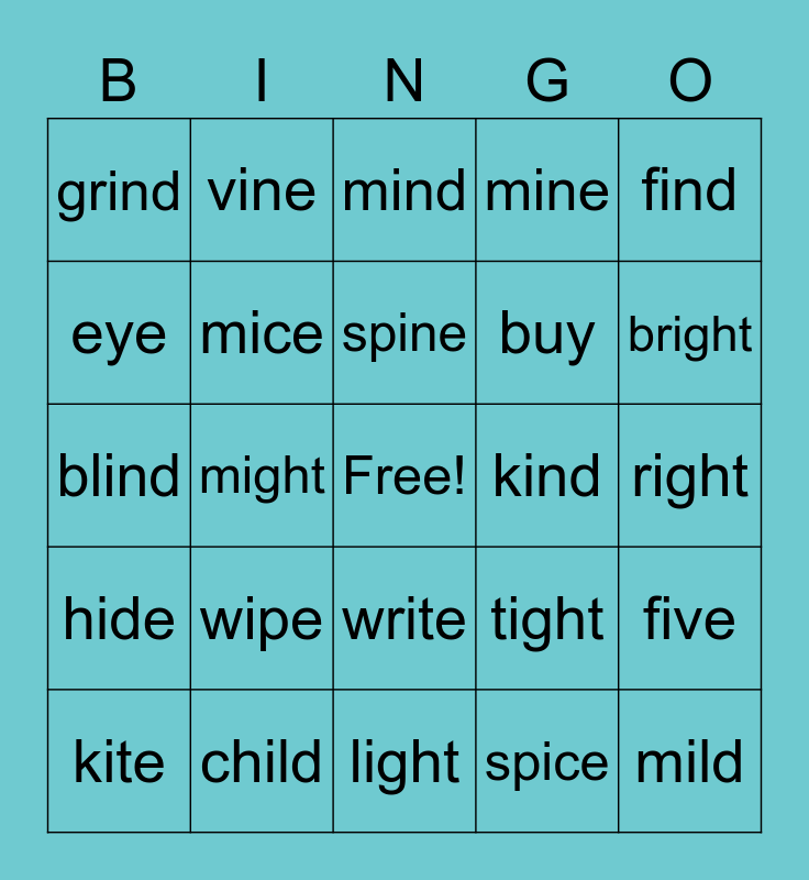 This bingo card has a free space and 29 words: kite, bride, might, sight, grind, mind, mice, wipe, kind, child, right, mild, light, spice, bright, night, write, hide, find, blind, tight, wild, buy, eye, mine, vine, five, spine and wife.