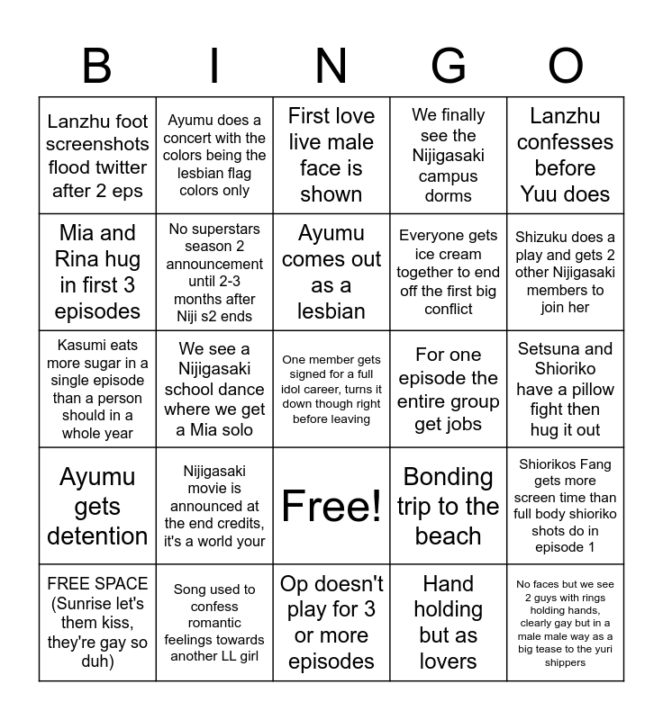 This bingo card has 26 words: Free!, Hand holding but as lovers, Ayumu comes out as a lesbian, Song used to confess romantic feelings towards another LL girl, Lanzhu confesses before Yuu does, Lanzhu foot screenshots flood twitter after 2 eps, Mia and Rina hug in first 3 episodes, Ayumu does a concert with the colors being the lesbian flag colors only, Setsuna and Shioriko have a pillow fight then hug it out, Bonding trip to the beach, Everyone gets ice cream together to end off the first big conflict, Kasumi eats more sugar in a single episode than a person should in a whole year, Shiorikos Fang gets more screen time than full body shioriko shots do in episode 1, FREE SPACE (Sunrise let's them kiss, they're gay so duh), We see a Nijigasaki school dance where we get a Mia solo, Rina watches LL 5 group on her computer to tease the summer season, We finally see the Nijigasaki campus dorms, Ayumu gets detention, First love live male face is shown, One member gets signed for a full idol career, turns it down though right before leaving, Shizuku does a play and gets 2 other Nijigasaki members to join her, Op doesn't play for 3 or more episodes, For one episode the entire group get jobs, Nijigasaki movie is announced at the end credits, it's a world your, No superstars season 2 announcement until 2-3 months after Niji s2 ends and No faces but we see 2 guys with rings holding hands, clearly gay but in a male male way as a big tease to the yuri shippers.