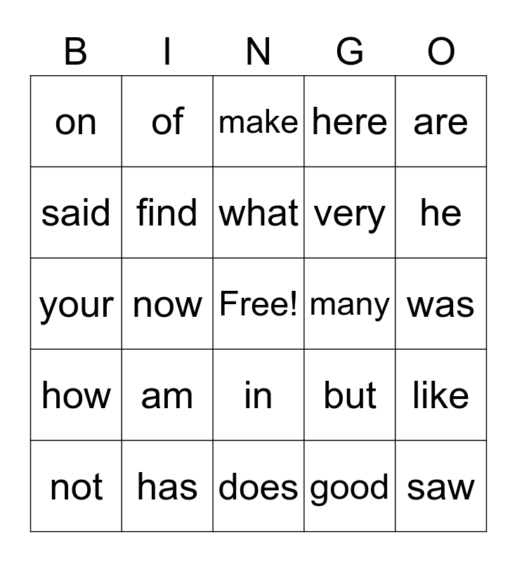 This bingo card has a free space and 24 words: am, has, what, not, are, on, said, of, many, in, very, your, but, like, find, good, was, make, he, now, saw, how, here and does.