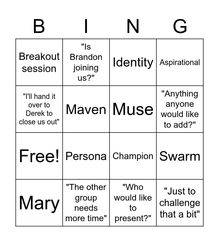 This bingo card has 20 words: Swarm, Miro board, Identity, Brand, Mary, "I'll hand it over to Derek to close us out", "The other group needs more time", Breakout session, Free!, "Is Brandon joining us?", Persona, Champion, Maven, "Just to challenge that a bit", Muse, Brand believer, "Anything anyone would like to add?", Aspirational, "Who would like to present?" and Archetype.