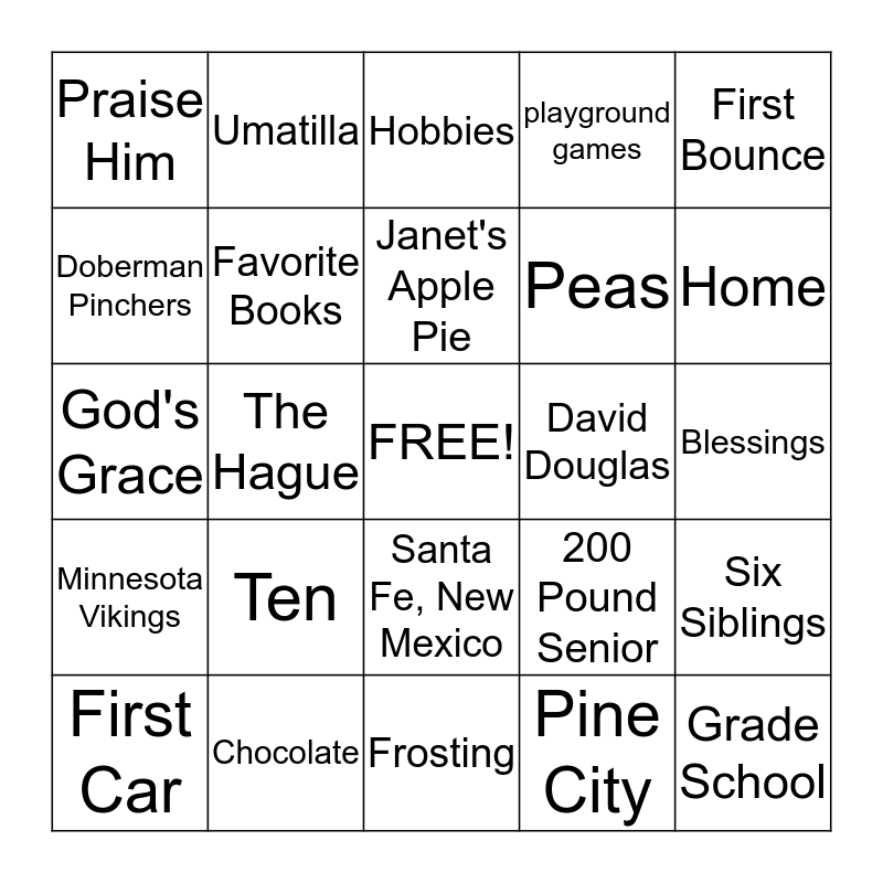 This bingo card has a free space and 35 words: Idaho Spud, Chicken Gizzards, London Broil Steak, Favorite Books, Santa Fe, New Mexico, playground games, Doberman Pinchers, Lam. 3:22-23, Janet's Apple Pie, Hot Air Balloon, God's Grace, First Bounce, Ping Pong, Foot Power, Praise Him, David Douglas, Pine City, The Hague, Minnesota Vikings, Grade School, 200 Pound Senior, First Car, Six Siblings, Chocolate, Hobbies, Home, Portland, Minneapolis, Peas, Blessings, Rugby, Frosting, Ten, Umatilla and Theatre.