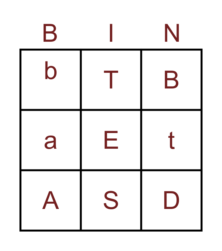 This bingo card has 9 words: A, B, T, a, b, t, E, D and S.