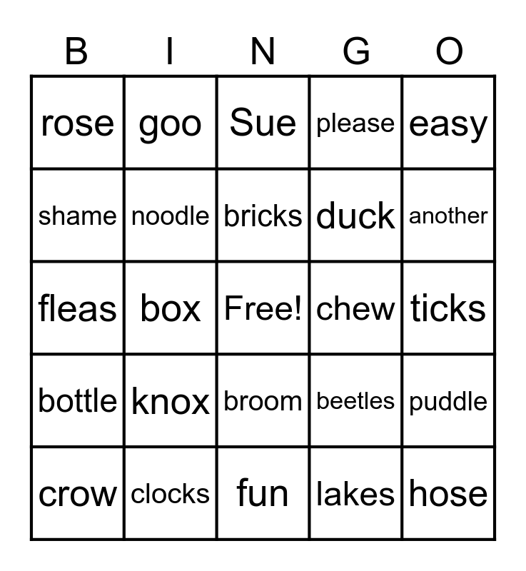 This bingo card has a free space and 24 words: knox, clocks, bricks, crow, easy, rose, shame, goo, chew, broom, duck, fleas, beetles, puddle, noodle, lakes, ticks, Sue, another, box, hose, bottle, please and fun.