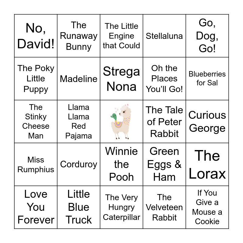 This bingo card has a free space and 31 words: The Very Hungry Caterpillar, The Rainbow Fish, Llama Llama Red Pajama, Chicka Chicka Boom Boom, No, David!, The Little Engine that Could, Madeline, Green Eggs & Ham, The Tale of Peter Rabbit, The Velveteen Rabbit, Curious George, If You Give a Mouse a Cookie, Where the Wild Things Are, The Cat in the Hat, Blueberries for Sal, Let the Pigeon Drive the Bus, The Lorax, Corduroy, Miss Rumphius, Winnie the Pooh, Go, Dog, Go!, Eloise, Love You Forever, The Runaway Bunny, Oh the Places You’ll Go!, The Poky Little Puppy, Stellaluna, The Stinky Cheese Man, Little Blue Truck, Strega Nona and The Giving Tree.