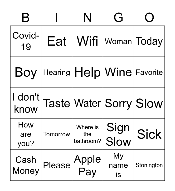 This bingo card has 60 words: Hi, Please, Thank you, How are you?, My name is, Deaf, Hearing, Beer, Wine, Yes, Woman, Man, Boy, Good, Buy, Covid-19, Water, Today, Price, Help, Sorry, Wifi, Cash Money, Sick, No, ID, Like, Love, Favorite, Open, Close, Hungry, Number, Thirsty, Eat, Dark, Light, Taste, $7, I don't know, Yesterday, Tomorrow, Slow, Again, Sign Slow, I'm learning, Bathroom, What (which) number?, Draft beer, Where is the bathroom?, Apple Pay, Coffee, $21, $63, Beer'd, Want, do you want to open a tab, Groton, Stonington and Fruit.