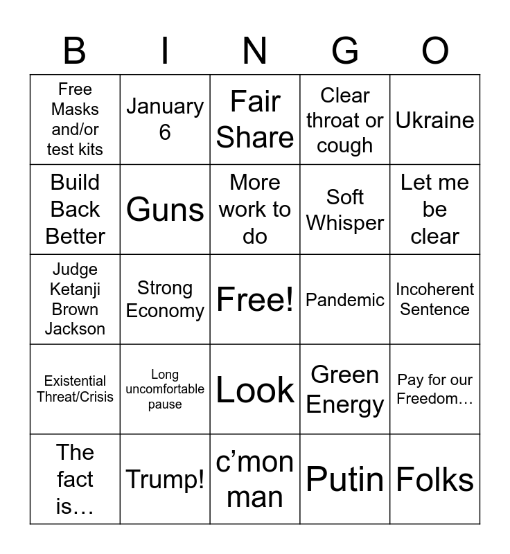 This bingo card has a free space and 24 words: Long uncomfortable pause, Trump!, More work to do, The fact is…, Ukraine, Free Masks and/or test kits, Build Back Better, January 6, Pandemic, Look, Soft Whisper, Judge Ketanji Brown Jackson, Green Energy, Pay for our Freedom…, Guns, Putin, Incoherent Sentence, Fair Share, Let me be clear, Strong Economy, Folks, Existential Threat/Crisis, Clear throat or cough and c’mon man.