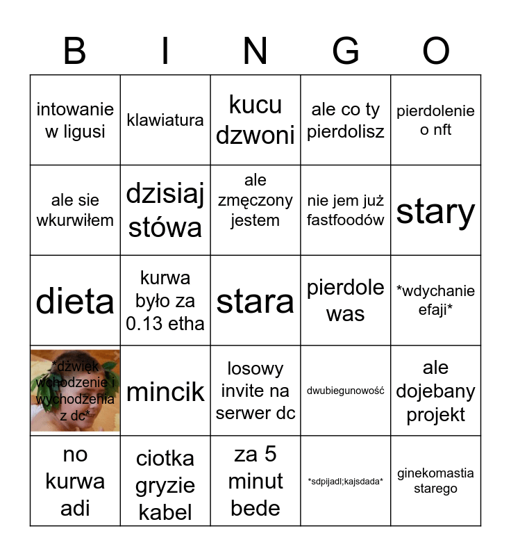 This bingo card has 1 images and 25 words: mincik, za 5 minut bede, ale zmęczony jestem, no kurwa adi, pierdolenie o nft, intowanie w ligusi, ale sie wkurwiłem, klawiatura, pierdole was, losowy invite na serwer dc, nie jem już fastfoodów, dieta, dwubiegunowość, ale dojebany projekt, dzisiaj stówa, ginekomastia starego, *wdychanie efaji*, kucu dzwoni, stary, kurwa było za 0.13 etha, stara, ciotka gryzie kabel, *dżwięk wchodzenie i wychodzenia z dc*, ale co ty pierdolisz and *sdpijadl;kajsdada*.