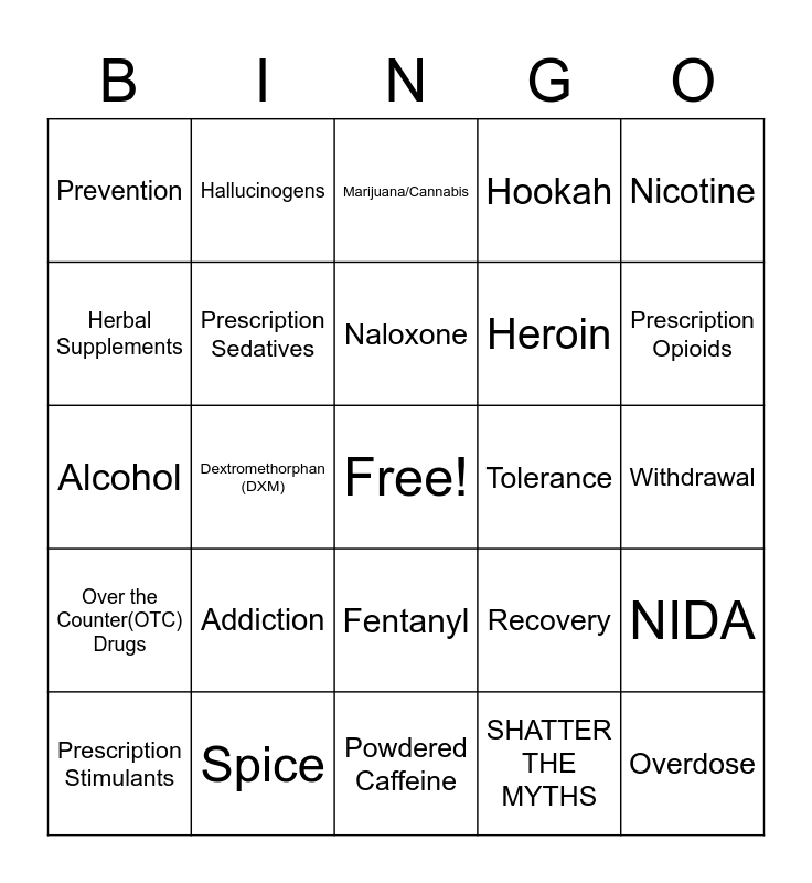 This bingo card has a free space and 39 words: Vaping, Medical Marijuana, Edibles, Prescription Sedatives, Prescription Stimulants, Fentanyl, Naloxone, Bath Salts, Nicotine, Over the Counter(OTC) Drugs, Dextromethorphan (DXM), Hookah, Overdose, Withdrawal, Tolerance, Addiction, Drugged Driving, Prevention, Addiction Treatment, Recovery, Herbal Supplements, Powdered Caffeine, Heroin, Prescription Opioids, Inhalants, E Cigarettes, Cocaine, Drugs and Health Blog, MDMA (Molly/Ecstasy), Hallucinogens, Methamphetamine, Anabolic Steroids, Marijuana/Cannabis, Spice, SHATTER THE MYTHS, LSD, NIDA, Alcohol and Cannabis Hyperemesis Syndrome.