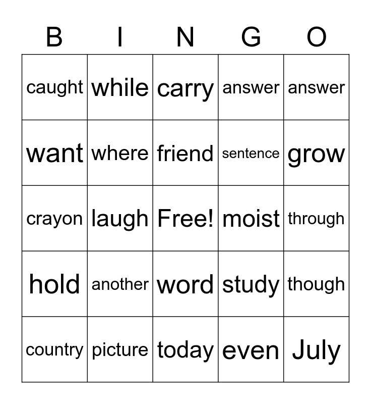 This bingo card has a free space and 24 words: another, picture, friend, country, answer, caught, want, while, moist, word, sentence, crayon, study, though, where, even, through, carry, grow, laugh, July, hold, answer and today.