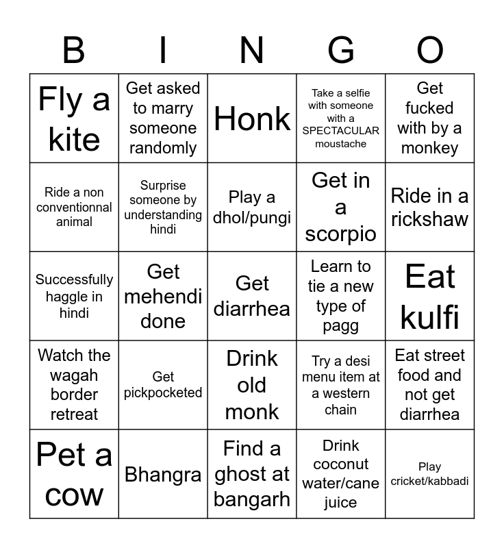 This bingo card has a free space and 24 words: Get pickpocketed, Bhangra, Play a dhol/pungi, Pet a cow, Get fucked with by a monkey, Fly a kite, Ride a non conventionnal animal, Get asked to marry someone randomly, Learn to tie a new type of pagg, Drink old monk, Get in a scorpio, Successfully haggle in hindi, Try a desi menu item at a western chain, Eat street food and not get diarrhea, Surprise someone by understanding hindi, Drink coconut water/cane juice, Eat kulfi, Honk, Ride in a rickshaw, Get mehendi done, Play cricket/kabbadi, Watch the wagah border retreat, Take a selfie with someone with a SPECTACULAR moustache and Find a ghost at bangarh.