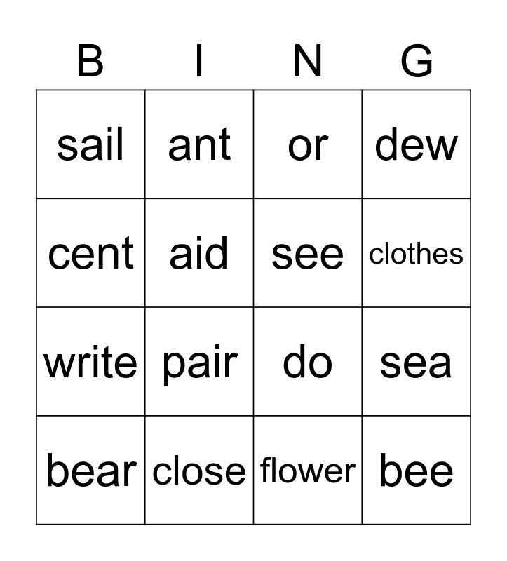 This bingo card has 50 words: tow, bear, bare, bawl, ball, aunt, ant, aide, aid, toe, see, dew, deer, dear, daze, days, clothes, close, scent, cent, sea, sale, sail, write, right, pear, pair, oar, or, male, mail, no, know, inn, in, our, hour, haul, hall, flower, flour, I, eye, you, ewe, do, sell, cell, bee and be.