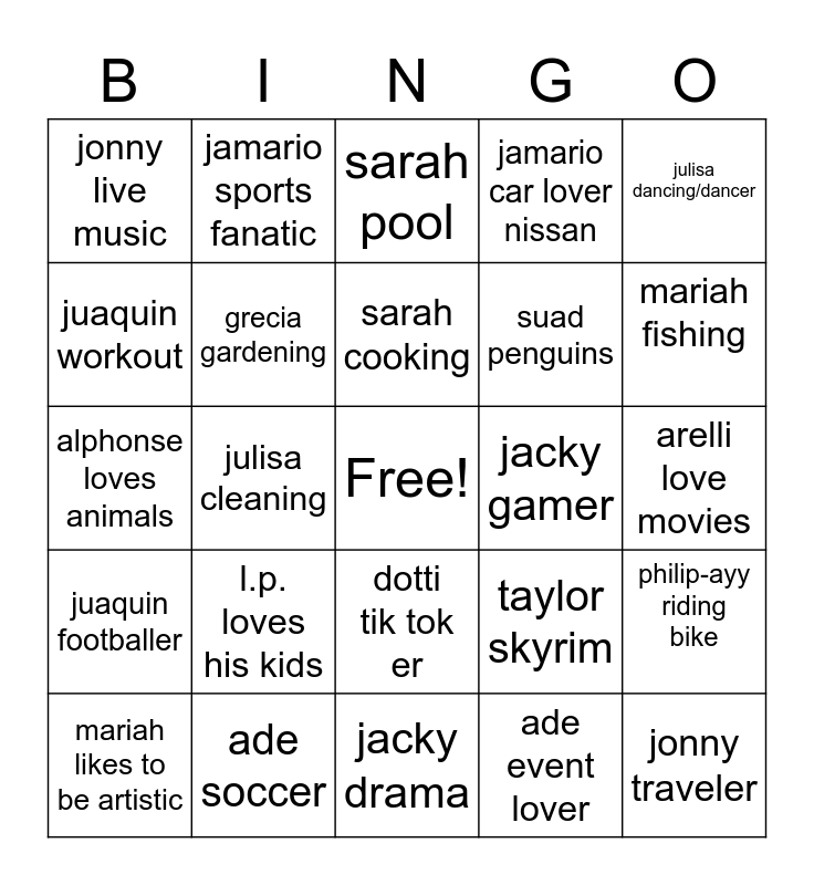 This bingo card has a free space and 24 words: l.p. loves his kids, ade soccer, sarah cooking, mariah likes to be artistic, julisa dancing/dancer, jonny live music, juaquin workout, jamario sports fanatic, jacky gamer, dotti tik tok er, suad penguins, alphonse loves animals, taylor skyrim, philip-ayy riding bike, grecia gardening, ade event lover, arelli love movies, sarah pool, mariah fishing, julisa cleaning, jonny traveler, juaquin footballer, jamario car lover nissan and jacky drama.