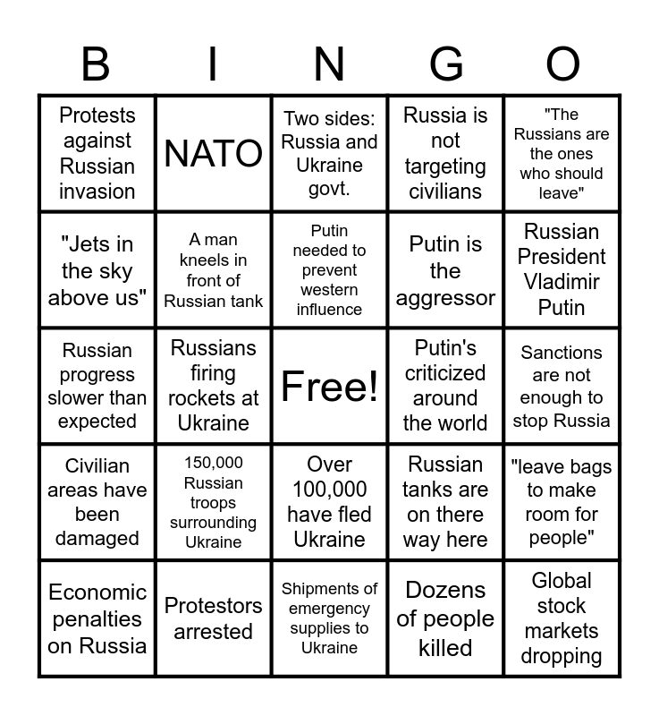 This bingo card has a free space and 24 words: 150,000 Russian troops surrounding Ukraine, Protestors arrested, Putin needed to prevent western influence, Economic penalties on Russia, "The Russians are the ones who should leave", Protests against Russian invasion, "Jets in the sky above us", NATO, Putin's criticized around the world, Over 100,000 have fled Ukraine, Putin is the aggressor, Russian progress slower than expected, Russian tanks are on there way here, "leave bags to make room for people", A man kneels in front of Russian tank, Dozens of people killed, Sanctions are not enough to stop Russia, Two sides: Russia and Ukraine govt., Russian President Vladimir Putin, Russians firing rockets at Ukraine, Global stock markets dropping, Civilian areas have been damaged, Russia is not targeting civilians and Shipments of emergency supplies to Ukraine.