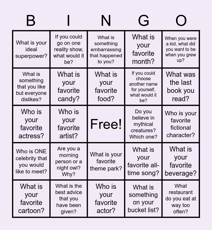 This bingo card has a free space and 24 words: Are you a morning person or a night owl? Why?, What is the best advice that you have been given?, What is your favorite food?, What is your favorite cartoon?, When you were a kid, what did you want to be when you grew up?, What is your ideal superpower?, What is something that you like but everyone dislikes?, If you could go on one reality show, what would it be?, Do you believe in mythical creatures? Which one?, What is your favorite theme park?, If you could choose another name for yourself, what would it be?, Who is your favorite actress?, What is your favorite all-time song?, What is your favorite beverage?, What is your favorite candy?, What is something on your bucket list?, Who is your favorite fictional character?, What is something embarrassing that happened to you?, What was the last book you read?, Who is your favorite artist?, What restaurant do you eat at way too often?, Who is ONE celebrity that you would like to meet?, What is your favorite month? and Who is your favorite actor?.