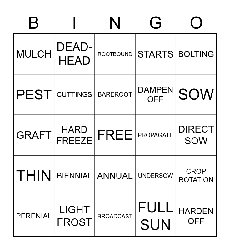 This bingo card has a free space and 24 words: BIENNIAL, LIGHT FROST, BAREROOT, PERENIAL, BOLTING, MULCH, PEST, DEAD-HEAD, PROPAGATE, ANNUAL, DAMPEN OFF, GRAFT, UNDERSOW, CROP ROTATION, CUTTINGS, FULL SUN, DIRECT SOW, ROOTBOUND, SOW, HARD FREEZE, HARDEN OFF, THIN, STARTS and BROADCAST.