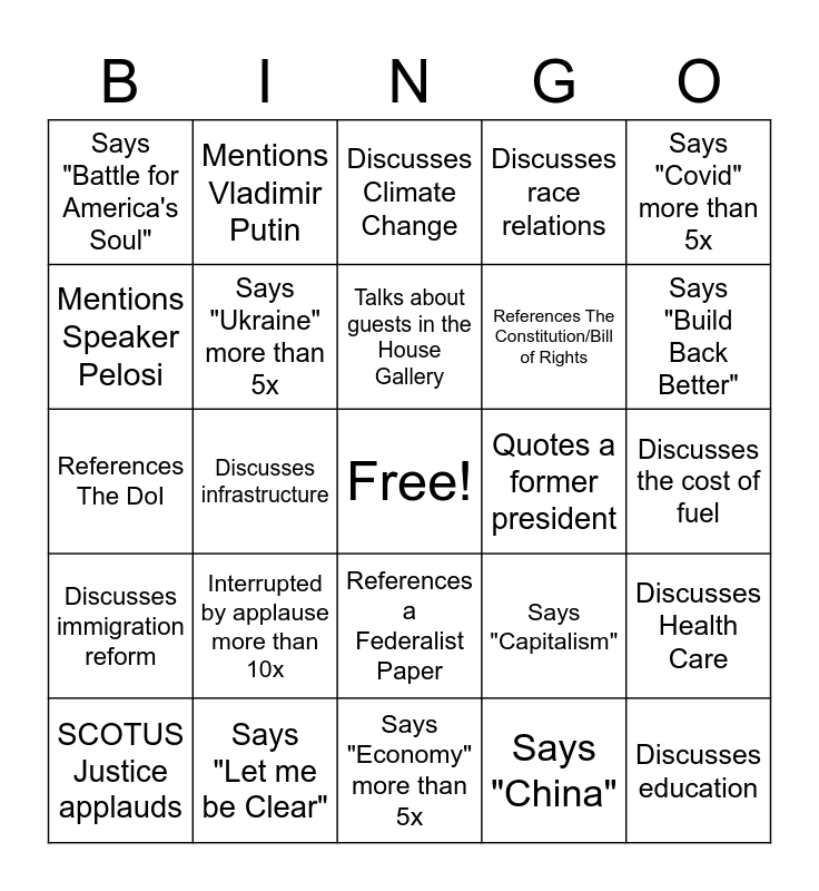 This bingo card has a free space and 24 words: Interrupted by applause more than 10x, Says "Let me be Clear", Talks about guests in the House Gallery, SCOTUS Justice applauds, Says "Covid" more than 5x, Says "Battle for America's Soul", Mentions Speaker Pelosi, Mentions Vladimir Putin, Quotes a former president, References a Federalist Paper, References The Constitution/Bill of Rights, References The DoI, Says "Capitalism", Discusses Health Care, Says "Ukraine" more than 5x, Says "China", Discusses the cost of fuel, Discusses Climate Change, Says "Build Back Better", Discusses infrastructure, Discusses education, Discusses immigration reform, Discusses race relations and Says "Economy" more than 5x.