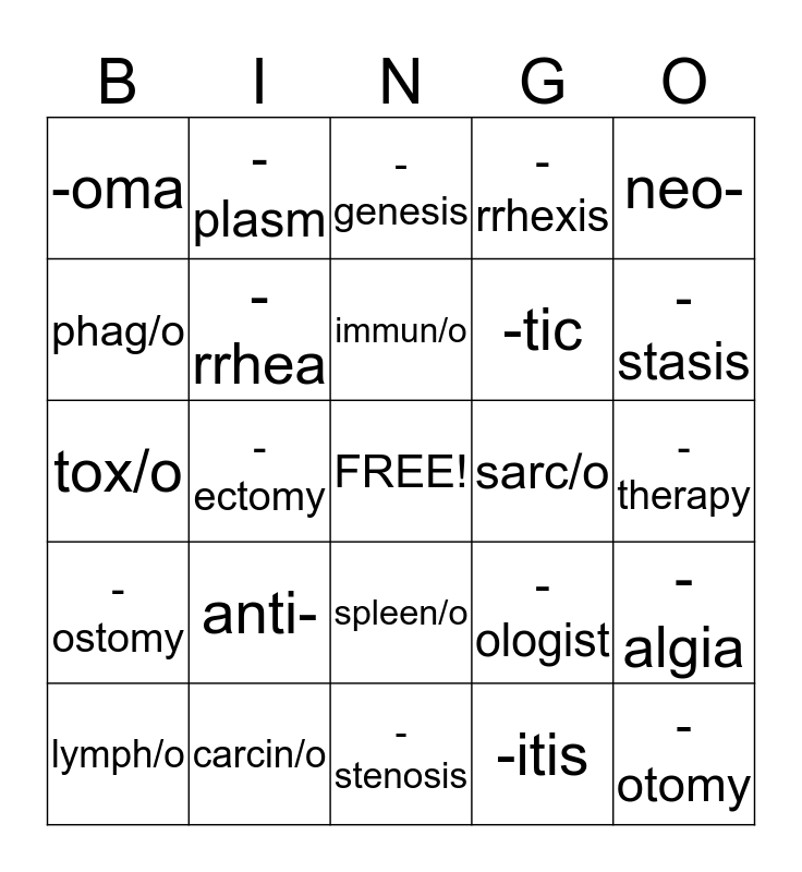 This bingo card has a free space and 24 words: anti-, carcin/o, immun/o, lymph/o, neo-, -oma, phag/o, -plasm, sarc/o, spleen/o, -tic, tox/o, -ologist, -algia, -rrhea, -itis, -therapy, -genesis, -stasis, -ectomy, -otomy, -ostomy, -rrhexis and -stenosis.