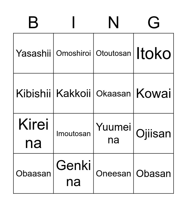This bingo card has 25 words: Free!, Kawaii, Kowai, Tanoshii, Kibishii, Yasashii, Kakkoii, Omoshiroi, Genki na, Shizuka na, Kirei na, Yuumei na, Kazoku, Otousan, Okaasan, Oniisan, Oneesan, Otoutosan, Imoutosan, Ojiisan, Obaasan, Ojisan, Obasan, Itoko and Kyoudai.