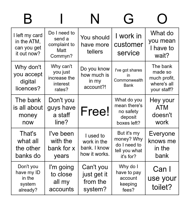 This bingo card has a free space and 24 words: I've been with the bank for x years, I'm going to close all my accounts, Do you know how much is in my account?!, Don't you have my ID in the system already?, What do you mean I have to wait?, I left my card in the ATM, can you get it out now?, Why don't you accept digital licences?, Do I need to send a complaint to Matt Commyn?, What do you mean there's no safety deposit boxes left?, I used to work in the bank. I know how it works., I've got shares in Commonwealth Bank, The bank is all about money now, But it's my money? Why do I need to tell you what it's for?, Everyone knows me in the bank, Why can't you just increase the interest rates?, Why do I have to pay account keeping fees?, Hey your ATM doesn't work, You should have more tellers, The bank made so much profit, where's all your staff?, Don't you guys have a staff line?, Can I use your toilet?, That's what all the other banks do, I work in customer service and Can't you just get it from the system?.
