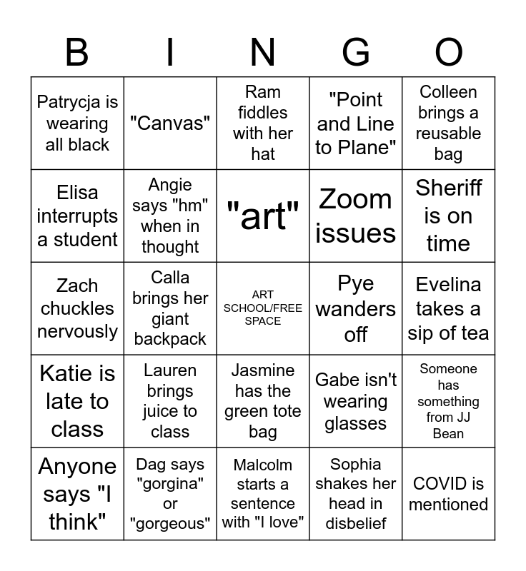 This bingo card has a free space and 29 words: Anyone says "I think", Elisa says "learning", Calla brings her giant backpack, Kenny can't contain their laughter, Patrycja is wearing all black, Ram fiddles with her hat, Angie says "hm" when in thought, Lauren brings juice to class, Pye wanders off, Dag says "gorgina" or "gorgeous", Evelina takes a sip of tea, COVID is mentioned, Malcolm starts a sentence with "I love", Sophia shakes her head in disbelief, Sheriff is on time, Luke falls asleep, Jasmine has the green tote bag, Katie is late to class, Colleen brings a reusable bag, Zach chuckles nervously, Gabe isn't wearing glasses, Joseph isn't wearing a hat, Zoom issues, Elisa interrupts a student, "Point and Line to Plane", "Canvas", Someone has something from JJ Bean, "art" and Someone has food from Haru Sushi.