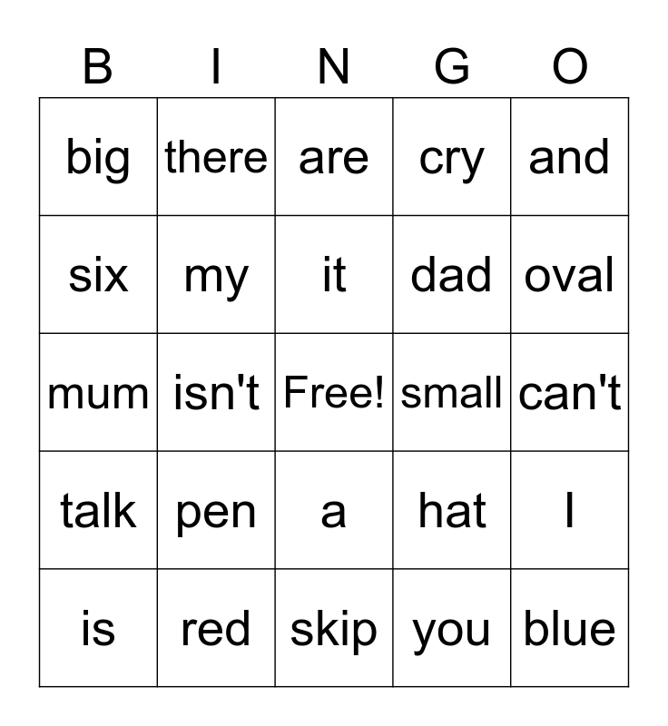 This bingo card has a free space and 24 words: pen, red, it, is, and, big, six, there, small, a, dad, mum, hat, I, my, you, can't, are, oval, isn't, blue, talk, cry and skip.