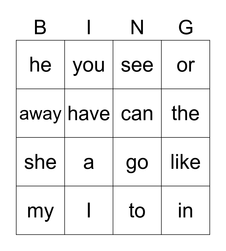 This bingo card has 16 words: I, like, see, he, she, you, go, to, away, have, my, or, a, the, can and in.