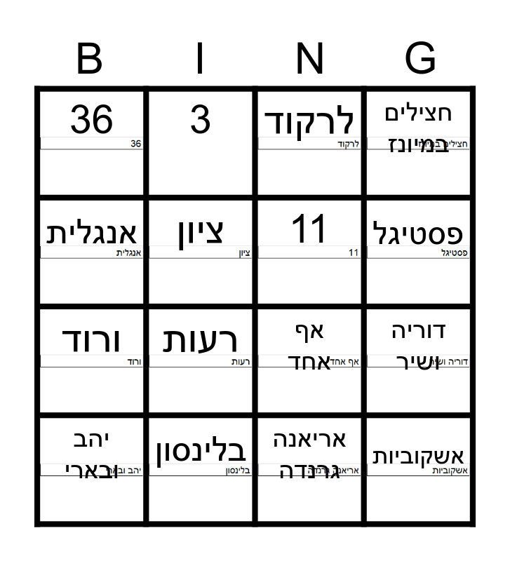 This bingo card has 18 images and 19 words: אף אחד, כ"ה שבט, לרקוד, אשקוביות, דוריה ושיר, אנגלית, אריאנה גרנדה, 36, 3, ורוד, רעות, ציון, 11, בלינסון, יהב ובארי, סושי, חצילים במיונז, פסטיגל and הופעות של שירים וריקודים.
