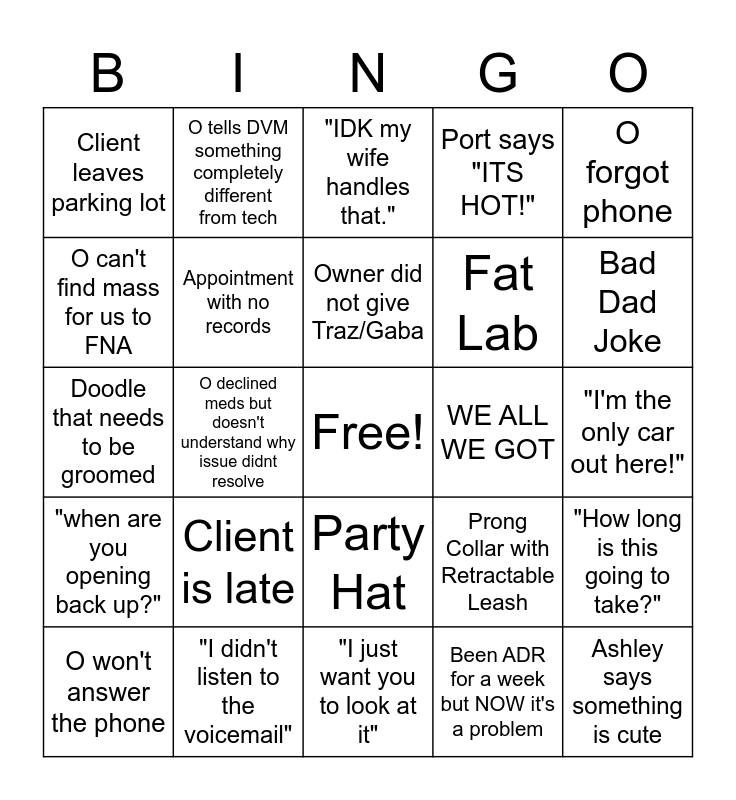 This bingo card has a free space and 24 words: Client is late, "I didn't listen to the voicemail", Owner did not give Traz/Gaba, O won't answer the phone, O forgot phone, Client leaves parking lot, O can't find mass for us to FNA, O tells DVM something completely different from tech, WE ALL WE GOT, Party Hat, Fat Lab, Doodle that needs to be groomed, Prong Collar with Retractable Leash, "How long is this going to take?", Appointment with no records, Been ADR for a week but NOW it's a problem, "I'm the only car out here!", "IDK my wife handles that.", Bad Dad Joke, O declined meds but doesn't understand why issue didnt resolve, Ashley says something is cute, "when are you opening back up?", Port says "ITS HOT!" and "I just want you to look at it".