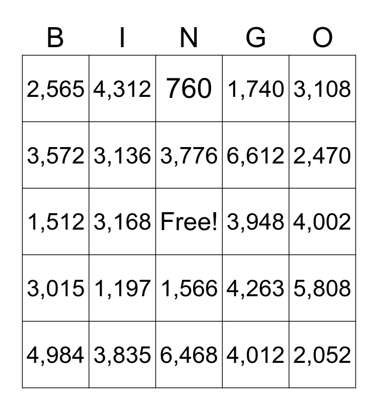 This bingo card has a free space and 25 words: 3,015, 3,835, 6,468, 4,012, 3,108, 2,565, 4,312, 760, 3,948, 5,808, 3,572, 3,136, 2,668, 4,263, 2,470, 4,984, 3,168, 3,776, 6,612, 4,002, 1,512, 1,197, 1,566, 1,740 and 2,052.