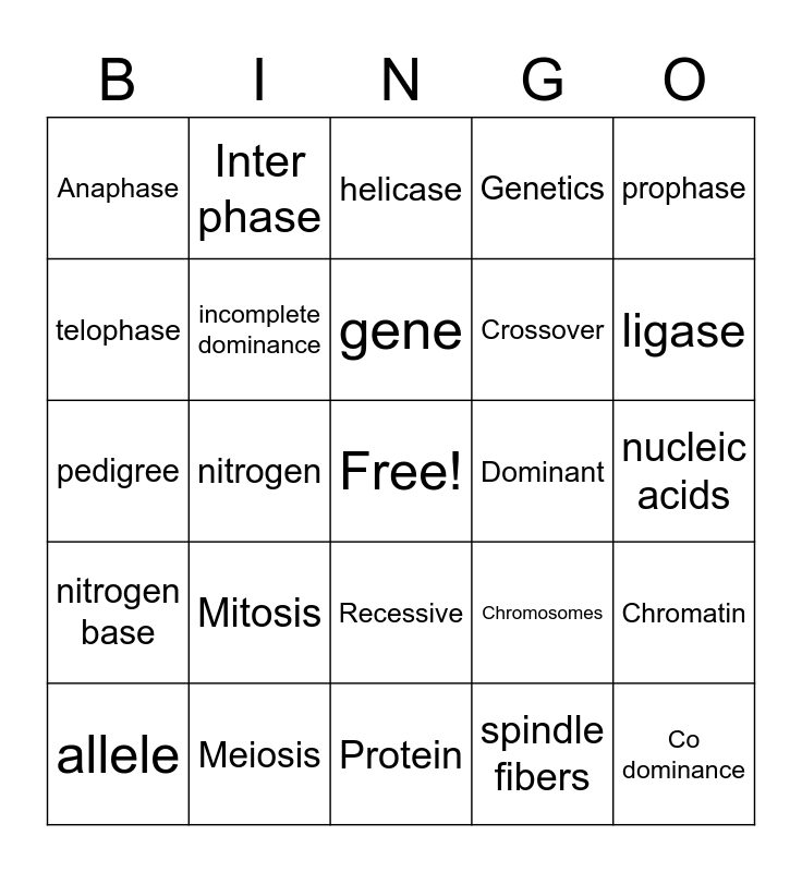 This bingo card has a free space and 24 words: Mitosis, Meiosis, gene, allele, prophase, Anaphase, telophase, Inter phase, Dominant, Recessive, Crossover, pedigree, Chromosomes, Chromatin, incomplete dominance, spindle fibers, nucleic acids, helicase, ligase, nitrogen, Co dominance, nitrogen base, Genetics and Protein.