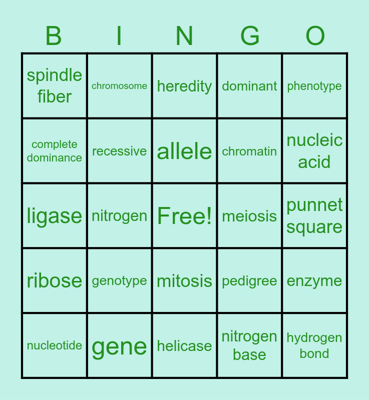 This bingo card has a free space and 24 words: genotype, gene, allele, nucleotide, phenotype, spindle fiber, complete dominance, chromosome, meiosis, mitosis, chromatin, ligase, pedigree, enzyme, recessive, nitrogen base, punnet square, heredity, nucleic acid, nitrogen, hydrogen bond, ribose, dominant and helicase.